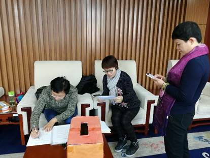 接着,在黄立君书记介绍换届选举投票规则及候选人情况后,党员老师们进行投票。之后由邓达老师唱票、郭琳老师计票、巫云仙老师监票,当场公布结果,选举成立了新一届经济学党支部委员。