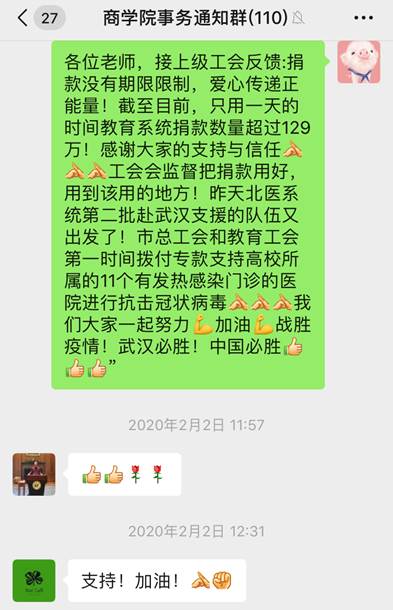 面对疫情,院工会发出倡议,组织教职工向湖北疫区自愿捐款,募捐由北京市温暖基金会直接对接湖北省总工会,直接对接到武汉相关医院及其医务人员,爱心传递正能量!仅用一天的时间教育系统捐款数量超过129万,北医系统两批赴武汉支援的队伍出发,市总工会和教育工会第一时间拨付专款支持高校所属的11个有发热感染门诊的医院进行抗击冠状病毒,爱心传递,大爱无疆!截至2月3号,北京教育系统捐款共计3859544.18元,22021名教职工颗颗爱心,其中公司有十几名教师通过校工会渠道捐款。温暖武汉,汇聚力量,战胜疫情!感谢老师们的祝福与支持!