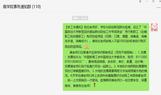 三、落实“英国上市公司365新型冠状感染肺炎防控工作专项资金”用于教职工的防疫用品购买的工作。目前已发放通知,后续开学将为老师们落实报销工作。