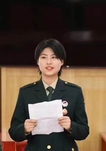 青年学子,校园筑梦。2021年的春夏,闵露妍参加到了在鸟巢举办的建党百年文艺演出中。这次数万人参与的文艺演出让报国的种子在闵露妍的心中开始萌芽,而后,她又投身于挑战杯的比赛中,这些实践让中国红再次在她的心中发光。入伍前,怀揣对国旗的热爱,她加入国旗护卫队,历严寒酷暑,锤炼意志,终立参军之志,入伍之路虽然面临重重挑战,但她专项训练,提升体能,终以坚忍不拔之志和优秀的政治素质圆军营梦,2022年3月,闵露妍背起行囊,告别校园,用实际行动诠释着对祖国的热爱与忠诚,激励着更多青年投身国防事业,共筑强国梦。