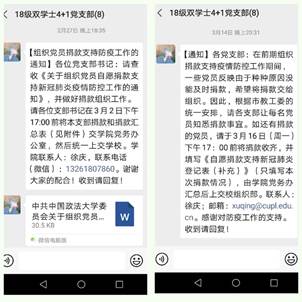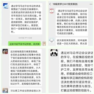 3月15日下午,线上理论学习会顺利召开后,党支部在微信群内组织支部党员分享了理论学习会上的学习心得,以及自己在配合所在地防疫工作期间的所思所想。支委会感谢了各位党员对每日信息上报、先锋岗和责任区报名、支持抗疫工作自愿捐款等各项支部工作的积极配合,解答了党员们关于目前校内情况的部分问题,并号召大家不要松劲,继续齐心协力,打赢这场防疫阻击战!