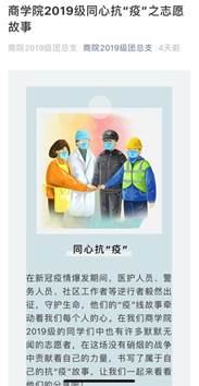 大一的新生也展现出了他们独特的活力,大家在各班团支书的组织下积极学习了疫情防护的相关知识,宣传疫情期间的正能量故事,也有同学准备了精心的手绘作品,一幅幅作品,就是一份份力量,大家共同为抗疫祈祷。19级团总支也在线分享了该年级员工们参加疫情期间志愿活动的身影和感想。