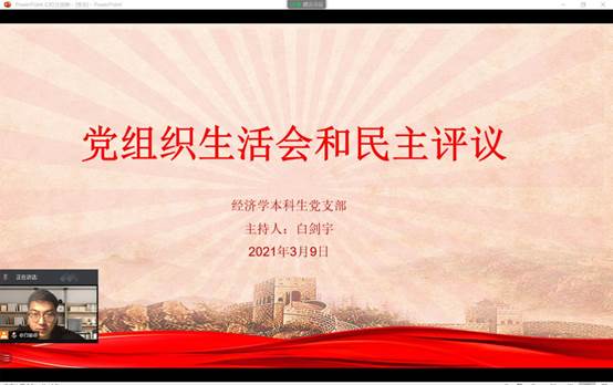 为深入学习贯彻习近平新时代中国特色社会主义思想,学习贯彻党的十九届五中全会精神,在进行了专题学习和交流的思想基础下,经济学本科生党支部在上级党委的领导下于2021年3月9日开展了组织生活会和民主评议党员,由党支部书记白剑宇主持此次会议。