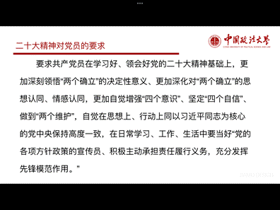 随后,为进一步学习党的二十大精神,教育引导广大党员保持奋发有为的精神状态,强化党支部成员的政治品格,瞿茜同志带领到会党员进行了本月的理论学习会,本次理论学习会的主题是“学习贯彻二十大精神、争做新时代好党员”。