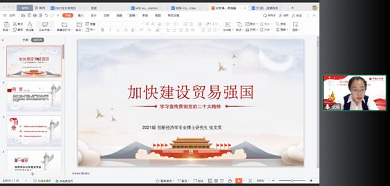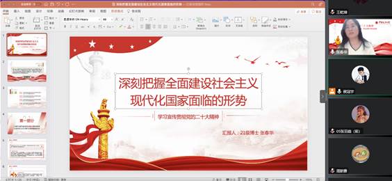 党支部书记侯冠宇明确本次理论学习的指导思想是“以党的二十大精神为引领,紧紧围绕学习宣传贯彻党的二十大精神”。学习主题是“中国式现代化的历史逻辑、理论逻辑与现实逻辑”。本次主讲人是2021级政治经济学博士生张春华、2021级创新经济学博士生高迪与张文英。