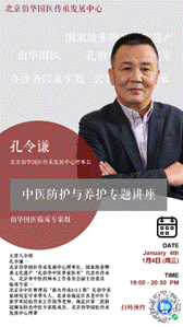 讲座主讲人是国家级非物质文化遗产“孔伯华中医世家医术”,代表性传承人,北京市中医药师承工作委员会副主任委员、北京伯华国医传承发展中心理事长孔令谦,一同参加讲座的还有,北京市中医管理局“薪火传承3+3工程”,孔伯华名家研究室学术带头人、北京市海淀区名老中医专家学术经验传承工作指导老师、海淀区第二批新冠肺炎防治中医专家组成员、北京伯华国医传承发展中心理事阮劲平、张绍才医生。