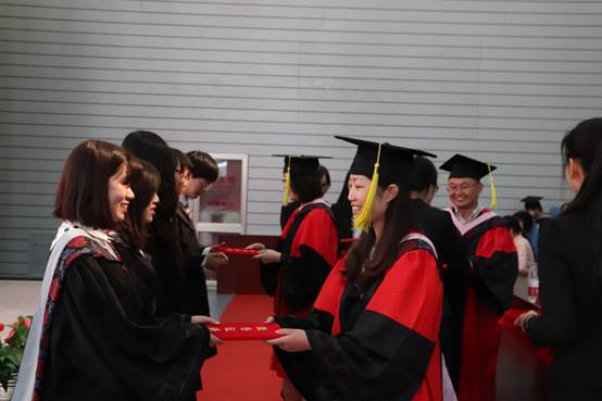 随着典礼接近尾声,何欣老师宣布,学位授予仪式正式开始。出席本次典礼的领导和老师分别为全体毕业生们授予毕业证书和学位证书,并拨帽穗、合影留念,祝贺他们顺利完成学业。