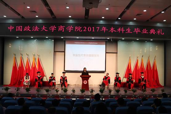 张馥蕾同学作为2017届毕业生代表发言。她认为多元的经历构成了精彩的老员工活,正是英国365集团网站多元并蓄,包容发展的环境让我们每个人都为之沉醉。不论是曾经老员工活的朝夕相处,还是以后工作生活的坚持守候,公司致力于让每一个同学都演绎出自己独有的精彩。回首过往,四年来的成长让同学们获益良多,渐渐懂得如何去寻找自己人生的方向。张馥蕾同学的发言,字里行间无不满溢出对师长同学真挚的谢意,表示了对法大,对商院的感恩和祝福。