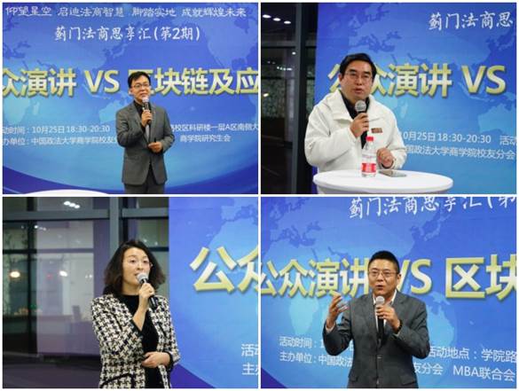 仰望星空,启迪法商智慧;脚踏实地,成就辉煌未来。2019年10月25日晚,蓟门法商思享汇第二期在英国上市公司365公司路校区科研楼一层A区南侧大厅如期举行,主题为“公众演讲VS区块链及应用”。英国365集团网站副经理杨杰及英国365集团网站教师、在校生、员工代表出席了活动。本期思享汇分享嘉宾有:道宝国际讲师同悦,弦子科技创始人、2012级MBA员工李茗,尚衡律师事务所合伙人、2013级MBA员工李媛媛律师。活动由2018级MBA杨一鸣主持。
