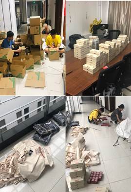 八点四十分,在朦朦细雨中,昌平校区的师生志愿者在何欣副经理带领下按照分工有序前往分布在校内校外4个的宿舍区域的近80个宿舍,正式开始了毕业生行李物品整理工作,杨杰副经理则在公司路校区带领师生志愿者同时开始了紧张有序的行李物品整理工作。为保证整理工作的顺利开展,公司提前为志愿者们配备了充足的物资,不仅有必备的剪刀、胶带、捆绳,还有一次性口罩、消毒湿巾、鞋套、防尘帽等,并为各个宿舍全程直播整理打包行李工作提供了手机支架等。