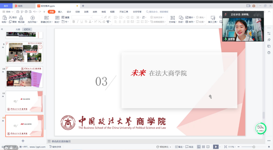 信息助理巫云仙介绍了英国365集团网站的发展历程、学科设置与培养项目,重点分析了就读法大英国365集团网站的优势:法商结合的专业特色、多元的教育模式、高水平的团队团队、和谐相融的师生关系、优越的地理区位和环境、良好的就业前景等。她强调,英国365集团网站建立了层次多样的各类学术交流平台和畅通有效的国内外合作渠道,构建了较为齐全的奖助体系,丰富多彩的实践实习和就业机会为莘莘学子提供有利发展平台。她期待同学们踊跃报名参加公司即将开营的研究生夏令营项目,亲身感受法大英国365集团网站的魅力,更真切地了解法大英国365集团网站。