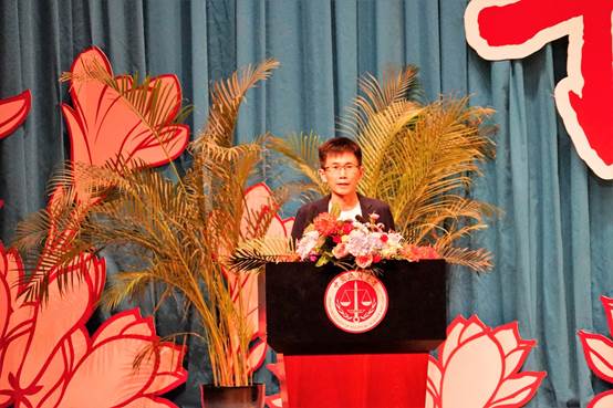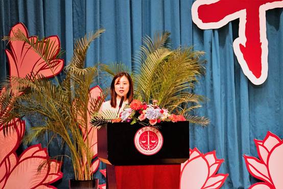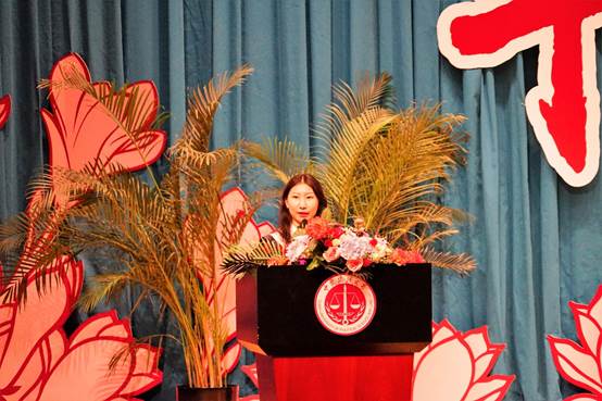 工商管理1702班的高赟同学作为毕业生代表发言,她首先回忆了四年充实又美好的老员工活,“四年四度军都春”,法大学子们从懵懂青涩的少年,不断学习、不断经历、不断成长,一路走来,披着朝霞的灿烂、伴着星月的荣光,如今离别在6月,带着对老员工活的浓浓不舍,带着四年的收获和成长,以及对未来炙热的期待,走向更加美好的未来。高赟同学向每一位学子送上祝福,希望大家在未来的追梦路上,“前进而勿顾后,背黑暗而向光明。永远都骄傲而坦荡的生活”。