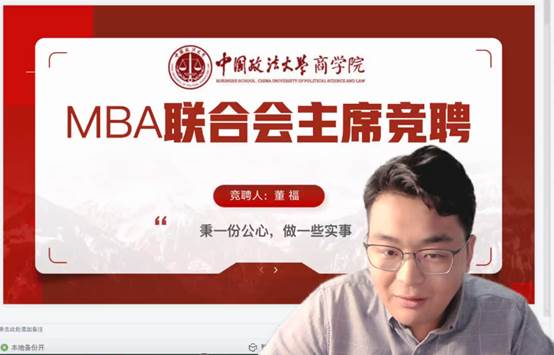 第四位竞选者王启林同学介绍了工作和管理经历,及他对联合会及联合会主席的理解,希望MBA活动扎根法大学子,联合会工作要从员工实际需求出发,尽力做好同学们与院校以及企业沟通的桥梁,传承与创新并举。最后阐述了自己有能力胜任和担当主席职位,可以结合自身优势更好地为同学们服务,让同学的MBA生涯获得实实在在的收获,让法大MBA品牌和影响力迈上新的台阶。