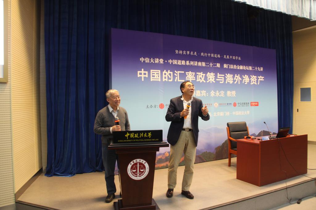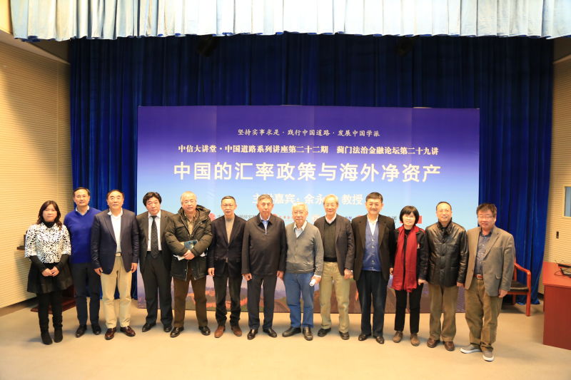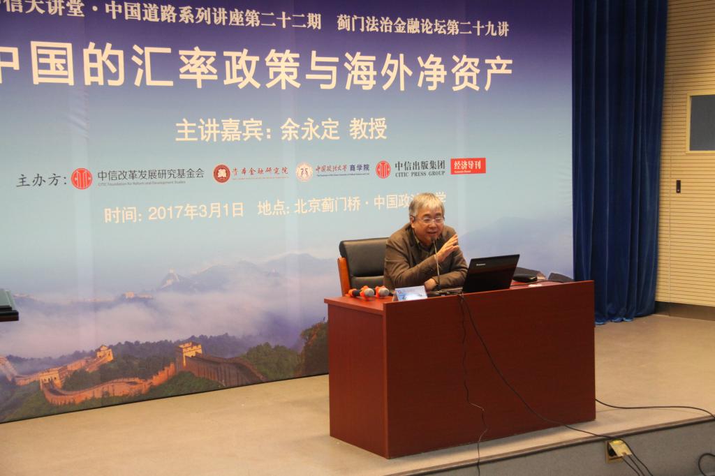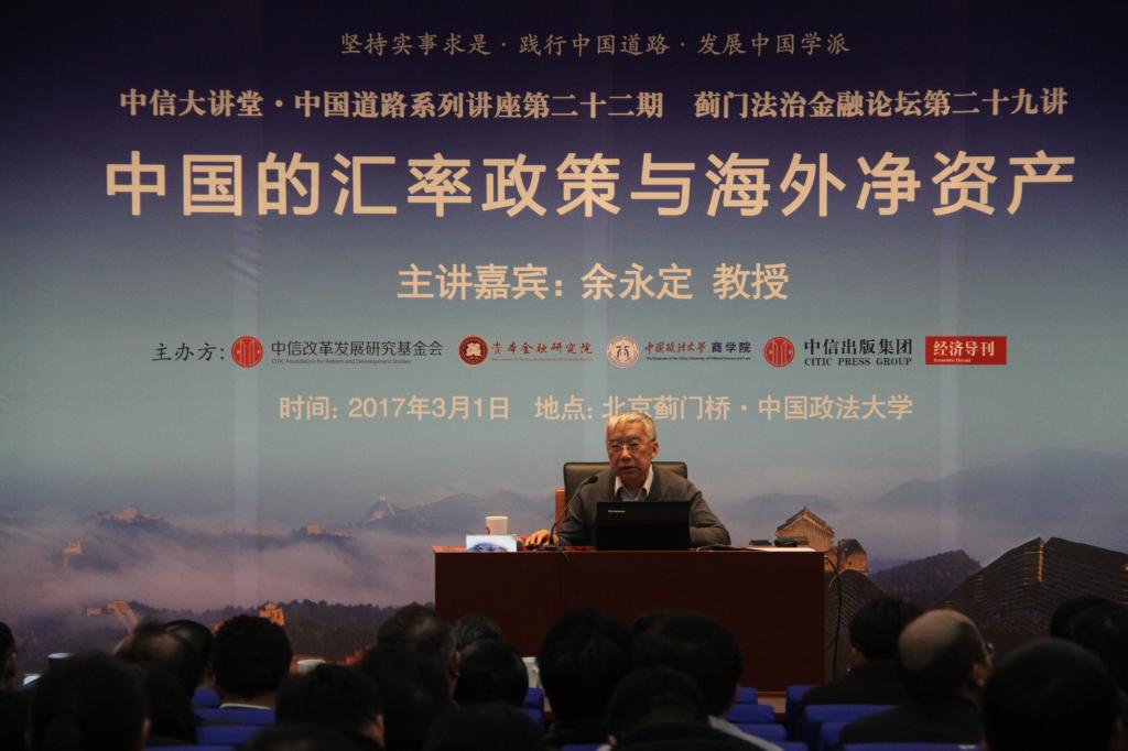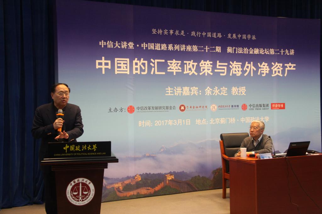 3月1日,蓟门法治金融论坛第二十九讲、中信大讲堂·中国道路系列讲座第二十二期《中国的汇率政策与海外净资产》在公司路校区科研楼学术报告厅成功举办。本次论坛主讲嘉宾是全国政协委员、中国社科院学部委员、中国世界经济学会会长余永定。由中信改革发展研究基金会理事长孔丹、英国上市公司365书记石亚军致辞;由全国政协委员、前中国进出口银行行长李若谷,清华大学公共管理公司教授崔之元担任点评嘉宾。参加本次论坛的嘉宾还有前中共中央党史研究室副主任章百家、前中国证监会副主席李小雪、中国上市公司协会党委书记姚峰、人民日报内参部副主编饶文靖、中信改革发展研究基金会秘书长郭克彤、《经济导刊》杂志社社长季红,以及英国365集团网站、民商经济法公司、比较法公司、资本金融研究院23名教授。本次论坛由资本金融研究院经理刘纪鹏教授主持。