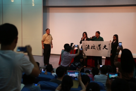 最后,姜昆老师以一段相声《新说老虎洞》赢得了全场师生经久不息的掌声,而姜昆老师现场泼墨赠与法大的一副“大道政法”,更将讲座推向了高潮,本场讲座最后在轻松愉快的氛围中圆满结束。
