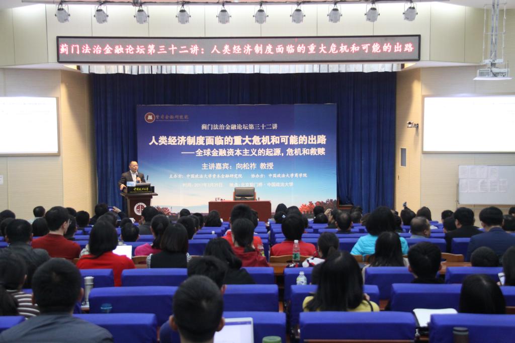 向松祚教授学识渊博,其著作《新资本论》在学界引起了巨大反响。整个演讲,面对全球金融资本主义这一非常前沿和深刻的话题,围绕起源梳理、危机分析和救赎方案,从现象到本质,从制度到理论,旁征博引,鞭辟入里,既有全球视野,又兼家国情怀,报告厅里不时传出热烈鼓掌声。对于法大师生来说,这是一次思想震撼教育,是对国际学术前沿的触摸,更是一次难得的思想盛宴。