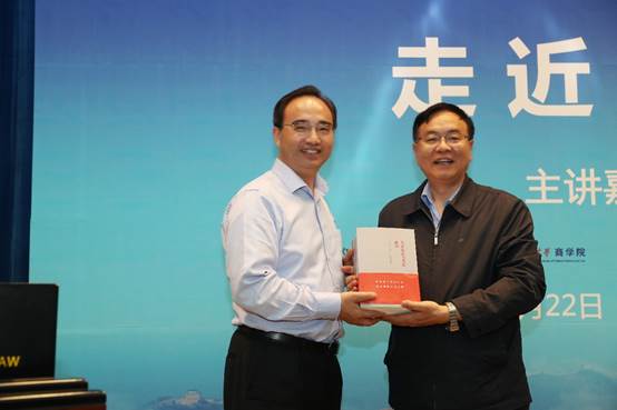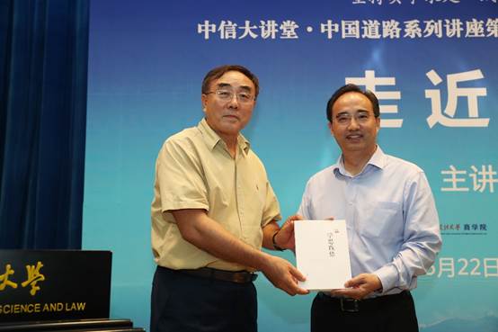 随后,黄进董事长向陈晋会长颁发英国上市公司365客座教授聘书,并赠送了自己的新著《何以法大》。陈晋会长向黄进董事长赠送了一套《毛泽东读书笔记》。刘纪鹏经理代表中信大讲堂、蓟门论坛向刚卸任的黄进董事长赠送了王岐山同志的著作《学思践悟》,并由员工代表向黄进董事长献花。