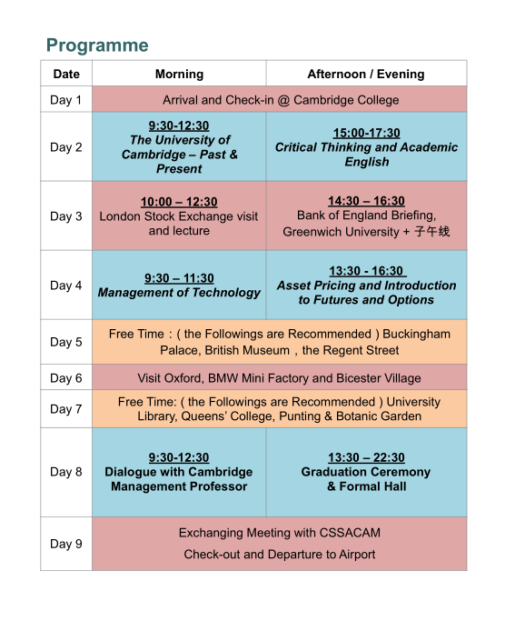3. 费用包含:剑桥大学团队、教室、住宿、剑桥项目对接老师和相关参访的交通费用。