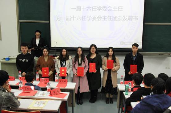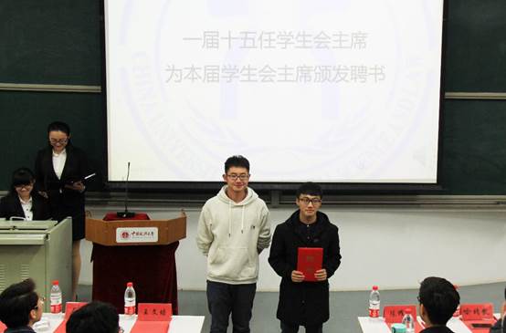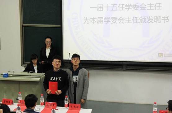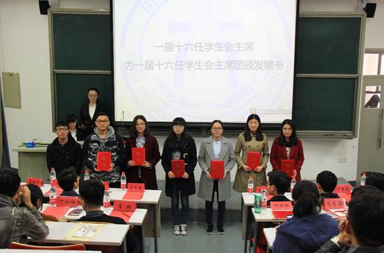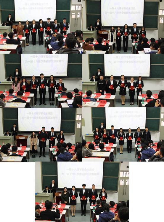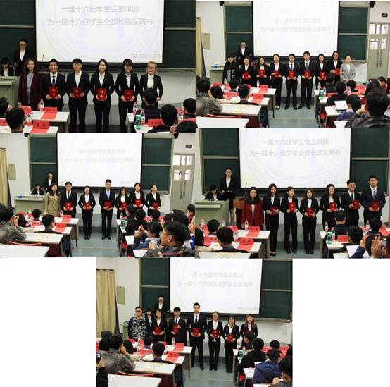 在热烈的掌声中,一届十五任学委会主任范翔宇和员工会主席王知行为优秀部长颁奖并合影留念。一届十五任学委会主任范翔宇和员工会主席王知行分别为一届十六任学委会主任唐铭和员工会主席付浩楠颁发聘书。随后,一届十六任学委会主任唐铭和员工会主席付浩楠分别为十六任学委会主任团和员工会主席团颁发聘书。各部门分管主席主任也分别为各部门部长颁发聘书并合影留念。