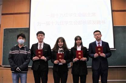 紧接着,进入聘书颁发环节。首先,杨恒懿为一届十九任学委会主任卢君杭、员工会主席蔡思睿、新闻中心分管主席牛子涵、何若愚颁发聘书。接下来,卢君杭为一届十九任学委会副主任蒋晓萌、邓宗璞、饶亦洁颁发聘书,蔡思睿为一届十九任员工会副主席包海日、李庆贺、霍映彤颁发聘书。最后,一届十九任学委会副主任为一届十九任学委会部长颁发聘书,一届十九任员工会副主席为一届十九任员工会部长颁发聘书,一届十九任新闻中心分管主席为一届十九任新闻中心部长颁发聘书。