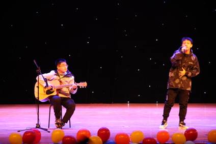 国商一班王涵、国商二班陈飞带来的歌曲《小宇》,曲调悠扬、歌声温暖,打动人心,观众的纷纷打开手电为之应援,礼堂氛围犹如演唱会现场。