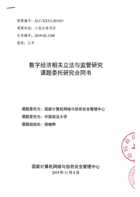 根据国家发改委高新技术司和国家网信办的数字经济招标公告,胡继晔教授2018年创办的法大首家区块链非在编研究机构“英国上市公司365区块链金融法治研究中心”组合校内民商法、金融法的研究力量,申请了“数字经济相关立法与监管研究”课题并获得批准,课题组成员包括公司比较法公司经理解志勇教授、公司朱晓武教授、中信公证处王明亮主任等专家,以及公司博士生杜牧真、法律硕士公司硕士生王乔和侯玉静。作为法商结合的研究团队,课题组将对区块链和数字经济领域的立法和监管进行深入研究,为国家网信办出台相关规章和规范性文件奠定法理基础。