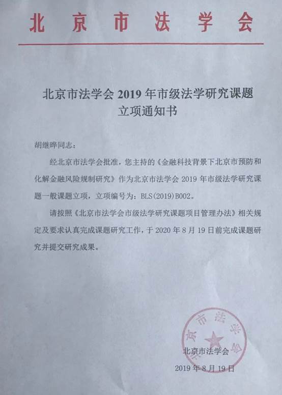 根据《北京市法学会2019年市级法学研究课题招标公告》,公司胡继晔教授申请了一般课题中的第二项“金融科技背景下北京市预防和化解金融风险规制研究”,在诸多法学类申请者中脱颖而出获得批准。该课题研究将对公司资本金融系金融监管方向的教学和科研起到良好的推动作用。