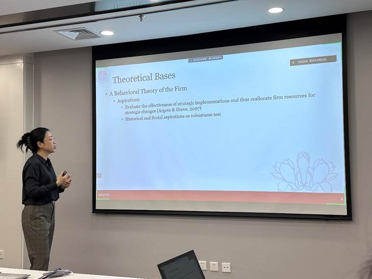 会议首先由张婷婷老师做主题报告,张婷婷老师从研究背景、研究目的、研究问题、理论基础、研究假设、研究方法、研究结果以及研究贡献与讨论等方面对自己的研究进行了阐述,该研究以跨国并购为背景,对企业绩效、领导人权力和并购时机之间的关系和机制进行了实证研究。