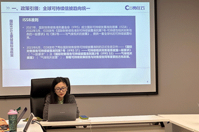 活动的第一阶段,张蒽教授进行了主题汇报。她介绍为什么会有ESG以及相关的影响,分析ESG教材的基本框架,以及讲述ESG如何在中国立足,树立话语权。她围绕《ESG基础教材》的开发、撰写、使用等环节对课程建设的功能进行了深入的说明和解释,基于ESG和企业社会责任的关联与差异,探讨了未来我国在ESG领域人才培养的重要性和必要性。