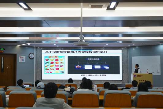 刘占一博士首先对人工智能进行介绍 ,主要谈到了人工智能的定义和发展历程,结合前三次工业革命,认为人工智能是新一轮科技革命和产业变革的重要驱动力量。而深度学习又是人工智能的关键核心技术,刘博士通过一个“如何让机器认识一个苹果”的小短片向大家形象的介绍了深度学习的过程;其次,刘博士介绍了知识增强大语言模型,认为大模型将成为人工智能发展的主流方向。并且,以百度研发的文心大模型为例,向大家介绍了知识增强大语言模型的工作原理。随后,刘博士介绍了由百度构建的飞桨深度学习平台,认为飞桨平台支撑文心一言的效果更好,效率更高,以“文心加飞桨,翩然赴星河”的描述来形容两者的协同作用。最后,刘博士向大家介绍了大模型的产业模式,认为需要由具有大数据、大算力、强算法的大企业来开发训练大模型,再将已封装好的大模型推向市场,以支撑各行各业对大模型的应用。