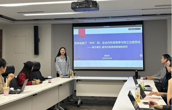 英国365集团网站工商管理系、工商管理党支部于2024年4月8日下午于公司路校区图书综合楼813会议室举办了第二十四期青年学术研讨会,由中国工运研究所劳动经济研究室助理研究员陈思宇博士带来题为“竞争加剧了‘996’吗:企业内外部竞争与员工过度劳动—基于雇主-雇员匹配调查数据的研究”的主题报告。研讨会由王辉主持,工商管理系郭颖、王玲、李璨、邵开愚等老师及多名博士和硕士研究生参会。