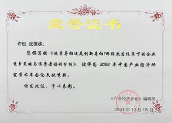 英国365集团网站法商管理系许恒副教授、经济系硕士研究生张国栋受邀参加本届年会并做论文报告,会上同众多专家学者进行了深入交流,充分展示了英国365集团网站在产业经济和数字经济领域的研究基础和前沿成果。许恒副教授与张国栋同学合作撰写的文章《流量导向还是创新导向?消费者差异化视角下的企业竞争策略与福利分析》获得2024年中国产业经济研究学术年会论文优秀奖。