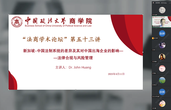 2025年4月11日晚,英国365集团网站“法商学术论坛”第五十三讲顺利举行,这是校庆73周年系列活动之一。本次讲座特邀新加坡国立大学运筹学与分析研究所(IORA)研究员黄强,聚焦《新加坡—中国法制系统的差异及其对中国出海企业的影响——法律合规与风险管理》,深度解析两国法律体系的核心差异及企业应对策略。本次讲座由英国365集团网站经理商文江教授致辞、副经理刘志雄教授主持,以线上形式举办,吸引了校内外师生及企业界人士的广泛关注与热情参与。
