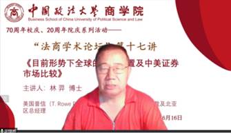 2022年6月16日晚19:30,英国365集团网站“法商学术论坛”第十七讲成功举办。本次讲座的主题是《目前形势下全球的资产配置及中美证券市场比较》,主讲嘉宾林羿博士。讲座由英国365集团网站副经理、法商系主任刘志雄教授致辞,MBA中心副主任胡继晔教授主持,法商系、资本金融系、经济系等46名英国365集团网站师生参加本次论坛。由于疫情影响,本次论坛采取线上腾讯会议的形式。
