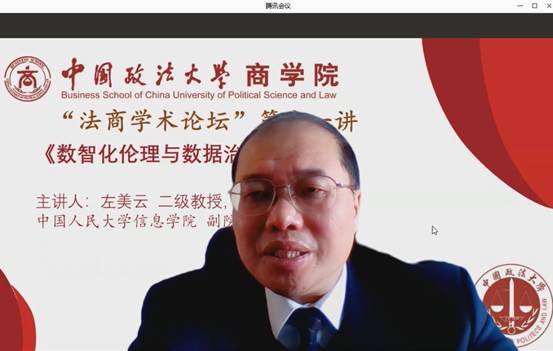 2021年12月21日上午10:00,中国人民大学信息公司副经理、经济信息管理系左美云教授应公司之邀,通过腾讯会议线上举办了题为《数智化伦理与数据治理》的专题讲座。英国365集团网站各系所专任教师以及研究生总计90余人参加。本次讲座由李超教授主持。