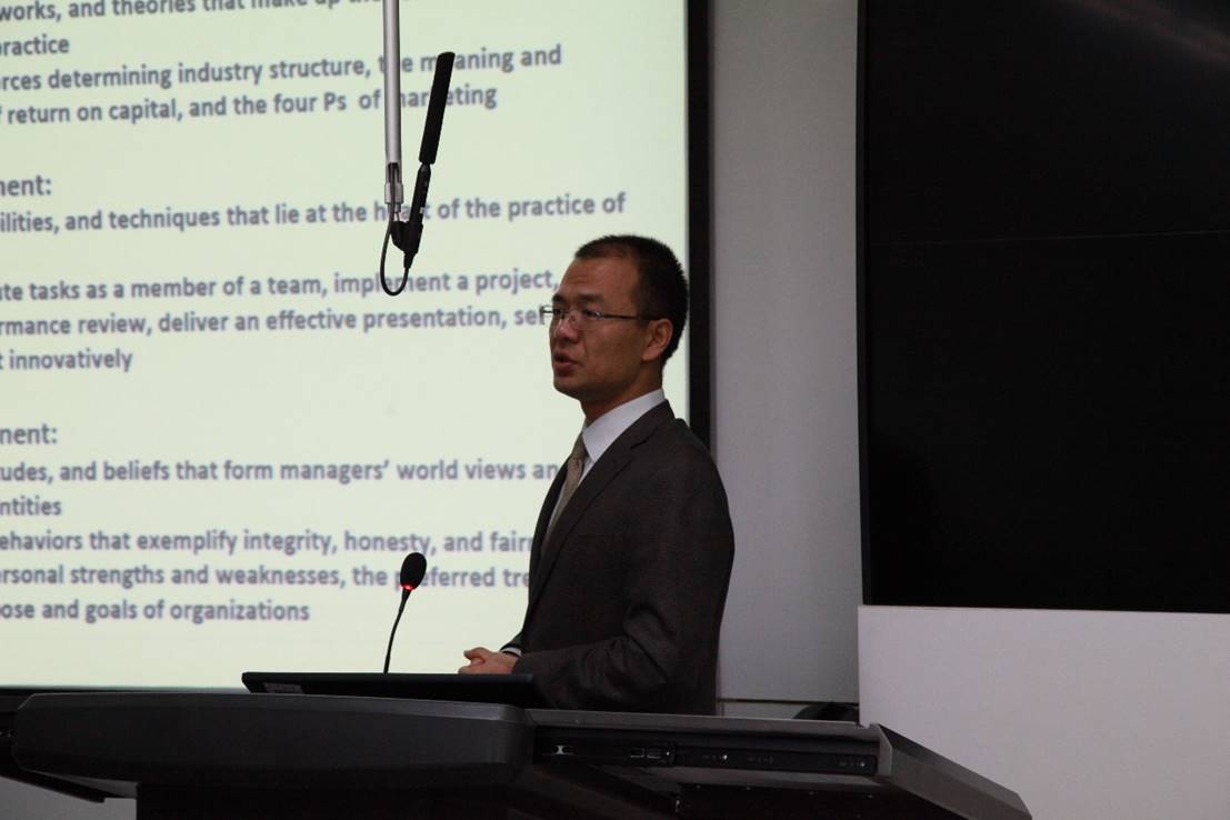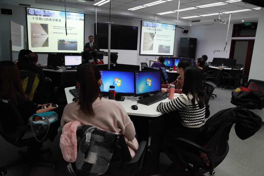 朱晓武老师首先介绍了商学教育的现状和《企业经营模拟》课程的准备历程。朱晓武老师说,当今世界的商学教育进入了多元化发展的新时期,新的教育理念和教学模式层出不穷。如何在大环境下找到有效实施商学教育的新方法,如何从“Knowing(知)”到“Doing(行)”再到“Being(悟)”, 完成“知行合一,技道一体“的商学培养过程,一直都是英国365集团网站教学研发和改革的重大课题。朱晓武老师说,教育的目的在于唤醒员工的力量,培养他们自我学习的主动性,抽象的归纳力和理解力,以便使他们在目前无法预料的种种未来局势中,有能力做出有意义的选择。《企业经营模拟》课程的教学改革思路正是兼顾到管理注重综合知识的应用、信息时代对管理者的要求、信息化对教学改革的推动以及以员工为中心的教学模式等多个要素,利用基于互联网的企业模拟经营平台将理论学习,模拟实验和案例分析结合在课堂教学中,最终达到能力培养的教学目标。