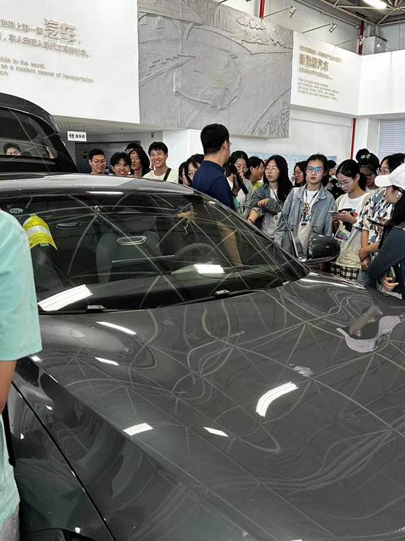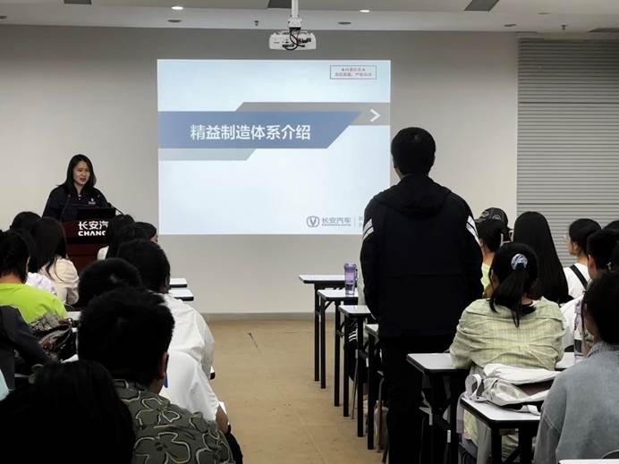 进入展厅内部,同学们先是近距离参观了长安汽车即将上市的最新油电混合汽车。随后,长安汽车生产体系负责人为同学们呈现了一堂精彩纷呈的精益制造体系课程。在课堂上,长安汽车的生产理念、精密科学的生产方式、严格细致的管理体制,以及长安汽车负责人深入浅出的讲解,引发了同学们高度的兴趣和热情。