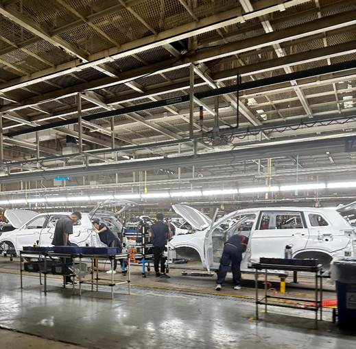 在最后也是同学们最为期待的生产线参观环节中,同学们分三批乘坐观览车进入厂房。负责人为同学们讲解了从冲压、焊接、喷漆到整装的各个生产环节。从车间布局到工人走位,无处不体现精益制造的管理思想。实地参观的体验也使同学们近距离的体会到生产管理的庞杂与精密。
