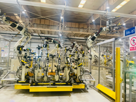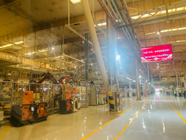 随后,师生们乘坐园区观光车进入智能生产工厂参观。工厂内部现代化的设备、整洁的环境、科学的管理布局和井井有条的工作程序给师生们留下了深刻的印象。负责人为同学们讲解了从冲压、焊接、喷漆到整装的各个生产环节,其中尤为值得一提的是,智能工厂的大部分生产环节均由机械臂完成,厂区内工人甚少。从车间布局到工人走位,无处不体现精益制造的管理思想。实地参观的体验也使同学们近距离的体会到生产管理的庞杂与精密。