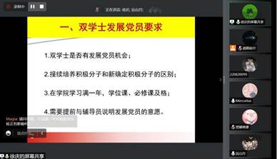 在辅导员贾老师和吴老师为同学们介绍过英国365集团网站基本概况和疫情防控纪律之后,教学科研办冯老师为同学们讲解了英国365集团网站第二学士学位的培养方案及课程、考务安排,就业中心孙老师为大家介绍了相关的就业政策和需要履行的相关手续。两位老师的介绍对于同学们接下来两年的学业和就业安排有着重要的意义。在这之后,党务办公室主任徐老师为大家介绍了双学士党员发展、党员教育管理和党组织关系转接等内容。这对同学们接下来的个人规划和自身发展有着指导作用。