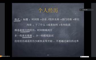 在第一部分“让你的简历合规则”中,胡琴老师首先强调了简历的目标是让招聘人员在短时间内了解大家的基本情况,求职意向以及让面试官充分意识到我们是否有能力胜任这份工作。因此在简历中,我们至少需要包括个人信息、求职意向、个人经历、教育经历、所获荣誉以及技能证书等六部分。