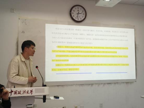 李成宇同学以《基于大国大城的因果链条分析》为主题,首先阐述了本书的重要观点:不能以扭曲生产要素(资本)价格和阻碍生产要素(人口、土地)流动的代价来发展经济,“平衡”是人均均衡而不是总量均衡。随后,他重点分析了资本深化过度(倾向资本密集型产业),资源错配与劳资关系,劳动力流动不充分等问题。最后,李成宇同学结合目前新一线城市的落户政策,分析了户籍制度改革面临的困境,认为户籍制度改革必须考虑土地经营效率和国家粮食安全问题。
