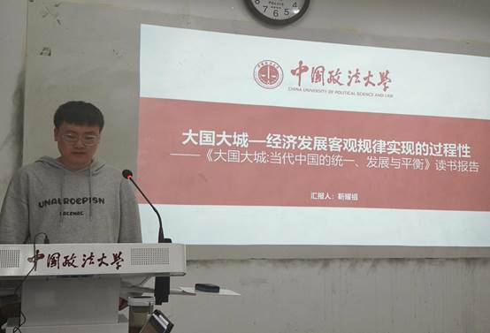 靳耀祖同学以《大国大城——经济发展客观规律实现的过程性》为主题,分析了中国生产要素的情况,阐述了城市的定义,梳理了全书的逻辑。他指出,在城市化的过程中会出现诸如交通拥堵、环境污染等问题。政府虽然制定了相关政策进行解决,但是从政策出台到政策落实需要一定时间,这意味着,解决城市化过程中出现的问题不是一蹴而就的。同时,靳耀祖同学针对大城市的抗冲击能力是否比农村强、大城市的生育率低等问题与老师、同学们进行了讨论。