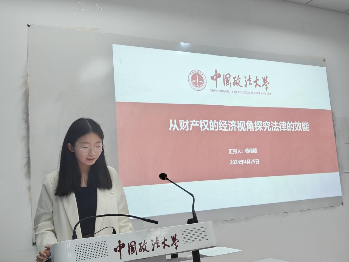 蔡雨颖同学以《从财产权的经济视角探究法律的效能》为主题,从财产权的经济分析、知识产权的经济分析、财产权的法律效能三个方面展开汇报。她指出,从法律的观点来看,财产是一组所有者自由行使并且其行使不受他人干涉的关于资源的权力。从经济学角度来看,财产权法涉及财产权的创设和界定,而财产权是对有价值资源进行排他性使用的权利。通过两个农夫种植谷物的案例分析,揭示出有效益的财产制度有三个准则:普遍性、排他性和可转让性。她强调,知识产权作为一种特殊的财产权,在现代社会中扮演着越来越重要的角色,但是侵权行为频发,从交易成本和社会成本理论介绍了侵权行为的产生原因,以及如何运用法律手段使得成本最小化。