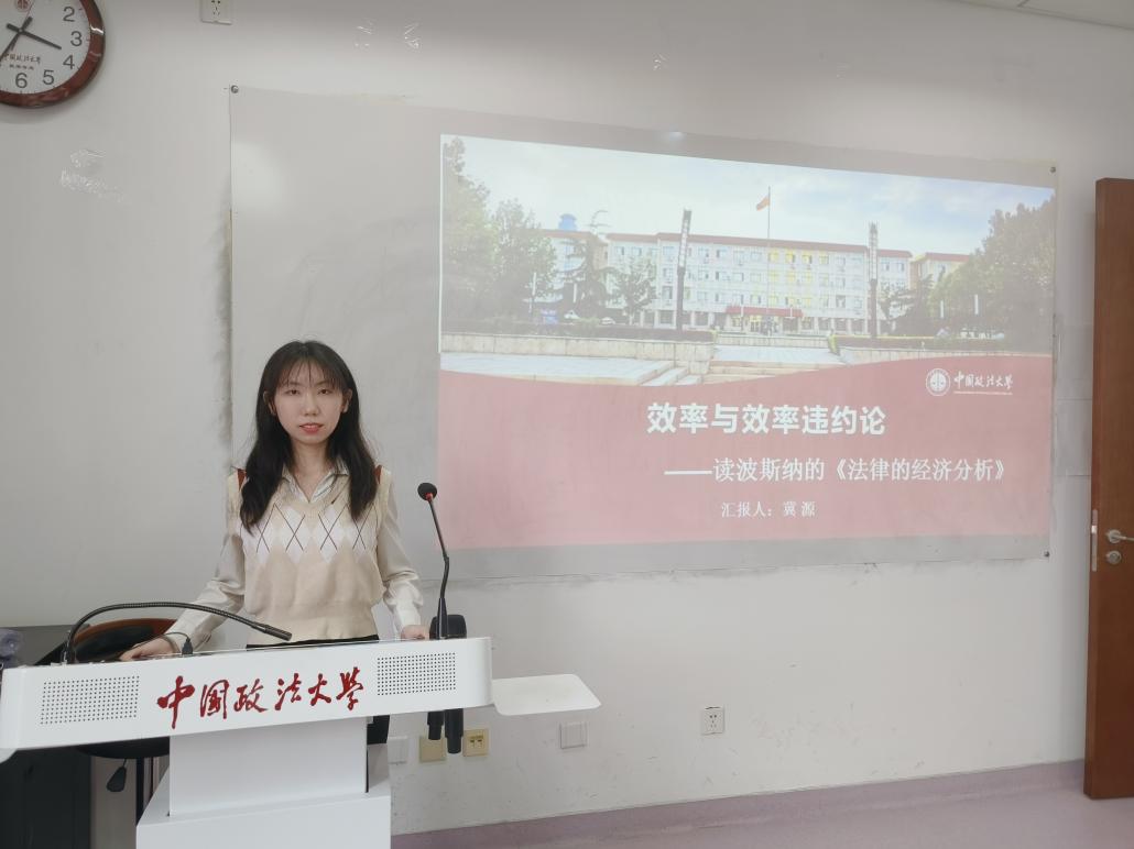 冀源同学以《效率与效率违约论》为主题,梳理了法经济学的历史发展阶段,结合案例对效率分析、效率违约论进行了深入的解读。她指出,效率违约理论认为,凡是对一方当事人来说其违约的效益高于履行的效益,则应鼓励其违约。效率违约理论把效率从经济学领域引入合同法领域,弥补了单纯法律分析方法的不足,极大地丰富了法律价值体系,但在现实生活中的隐性成本和隐性收益几乎是无法量化比较的,这使效率分析在法律价值冲突问题上无能为力。法律价值冲突问题贯穿于立法、司法和法学研究之中。实践中法律的价值判断往往交予法官从中协调,法官又依据其内心的正义标准作出选择。价值判断的不确定性与模糊性可想而知。