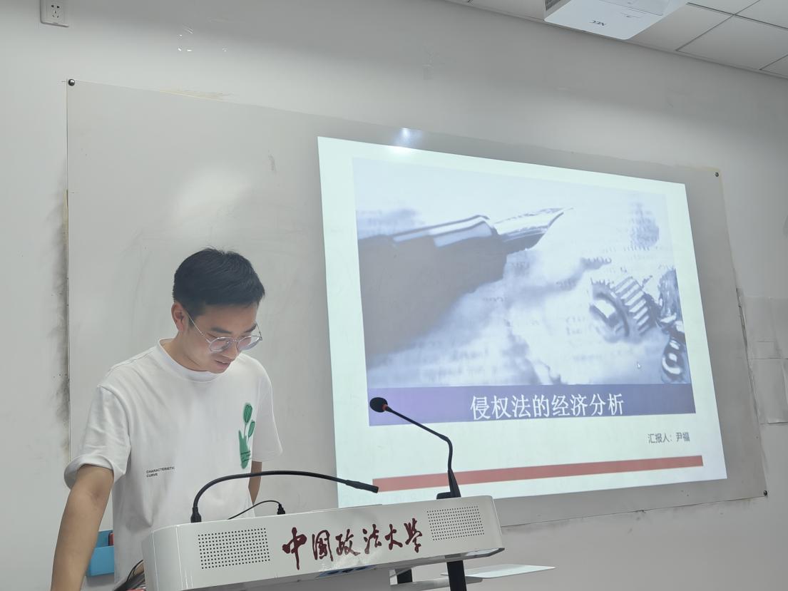 尹福同学以《侵权法的经济分析》为主题,从侵权法的经济本质、侵权法的基本法学构成以及侵权责任的经济理论三方面进行解读。他指出,侵权法是当一个人的权利受到侵害的时候,按照什么样的规则来认定侵害成立和按照什么样的标准使侵害人对受害人进行补偿的法律制度体系,并且以库特—尤伦模型、兰德斯—波斯纳两个经济学模型为例介绍了三种不同归责原则下的预防投入与预防激励,强调了过失责任制是相对于严格责任制和无责任制更优的责任规则。