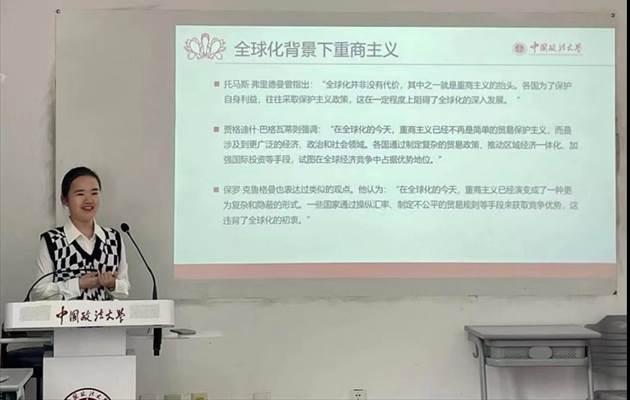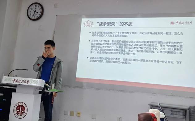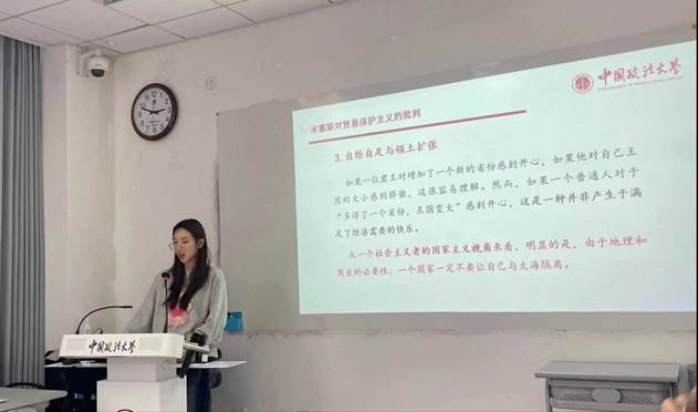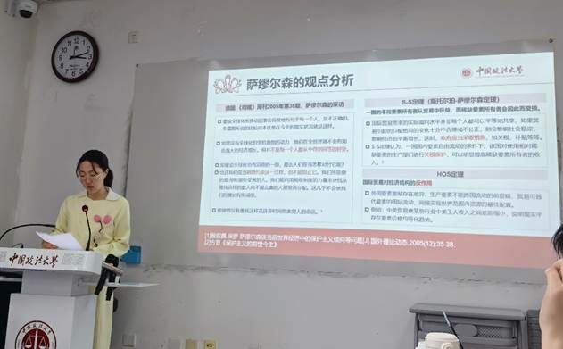 李晨晨同学通过对比不同经济学家的观点引入主题,介绍了重商主义的内容和施穆勒的主张、观点;以萨缪尔森的论文为题,着重探讨了“论文是否标志着萨缪尔森由自由主义转向保护主义”这个问题,总结提炼了自己的看法