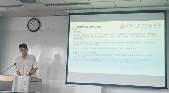 苏鑫铭同学分析了改革前计划经济体制下资源配置模式的特征,探讨了改革初期“财政包干制”在明确央地财政关系、激发地方发展活力方面的积极作用,并客观分析了该制度实施过程中出现的市场分割、规范运行等挑战。针对改革进程中中央财政统筹能力变化等问题,阐述了1994年分税制改革通过优化财税体制、规范分配关系来提升国家治理效能的逻辑,说明了该改革对地方政府经济管理模式转变的影响。最后,他以汉代《盐铁论》为例,强调了大国治理中集权与分权、效率与公平的平衡难题,以及政策转向所蕴含的制度成本问题。