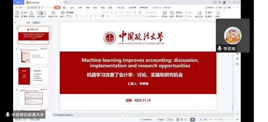 陈茉莉同学分享了《A picture is worth a thousand words: Measuring investor sentiment by combining machine learning and photos from news》、《廉价交谈还是言之有据?——分析师报告文本的信息含量研究》、《媒体情绪传染与分析师乐观偏差——基于机器学习文本分析方法的经验证据》三篇文献;丁怡同学分享了《Machine learning improves accounting estimates: evidence from insurance payments》、《内部控制意愿、内部控制水平与盈余管理方式———基于文本分析与机器学习的计量方法》、《数字化转型、竞争战略选择与企业高质量发展———基于机器学习与文本分析的证据》三篇文献;李若晴同学分享了《Machine learning improves accounting: discussion, implementation and research opportunities》、《管理者短视主义影响 企业长期投资吗?——基于文本分析和机器学习》、《董事会“内部控制专业胜任能力”重要吗?——基于文本分析和机器学习的经验证据》三篇文献。