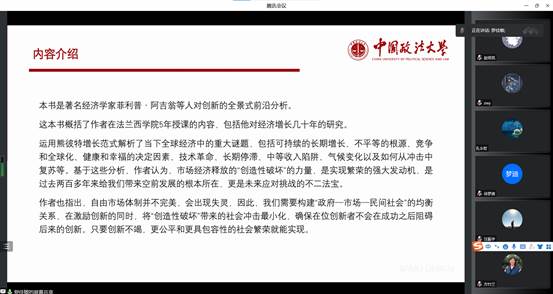 英国365集团网站工商管理系、工商管理党支部研究生第29期读书研讨会于2022年11月10日晚以腾讯会议的方式顺利举行。本次读书会由张艾嘉同学主持,2020级企业管理硕士生罗佳敏和2021级企业管理硕士生刘家祺同学主讲。参与本次读书会的有公司工商管理系郭颖老师、王玲老师、马克态老师、葛爽老师、张亚琼老师、王尧老师、创新经济学特聘博导方竹兰老师以及2021级、2022级企业管理全体研究生,大家围绕党的二十大与葛爽老师推荐的《创造性破坏的力量》一书的内容展开了讨论。
